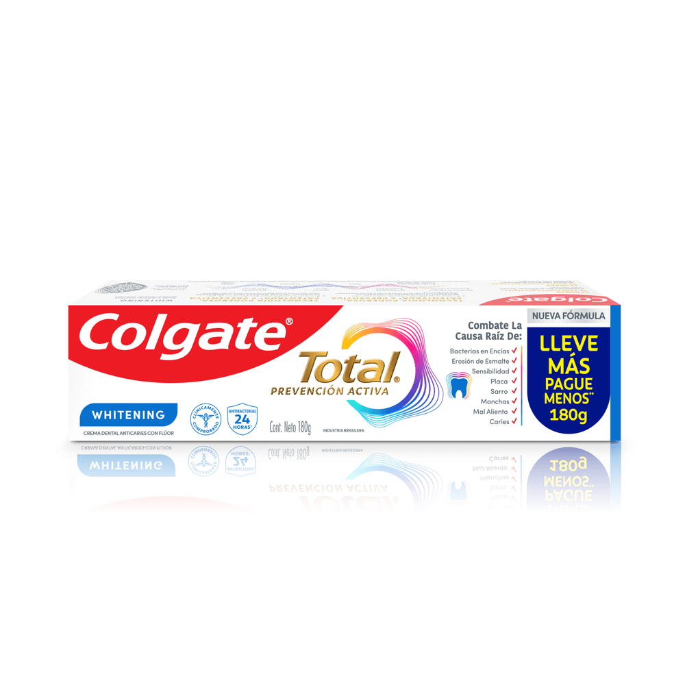 Colgate Total Whitening es ideal en el uso diario, está clínicamente comprobada, te brinda 24 horas de acción contra bacterias y ayuda a prevenir los problemas bucales antes de que aparezcan: bacterias en las encías, erosión de esmalte, sensibilidad en los dientes, placa bacteriana, sarro dental, manchas en los dientes, mal aliento y caries dental.