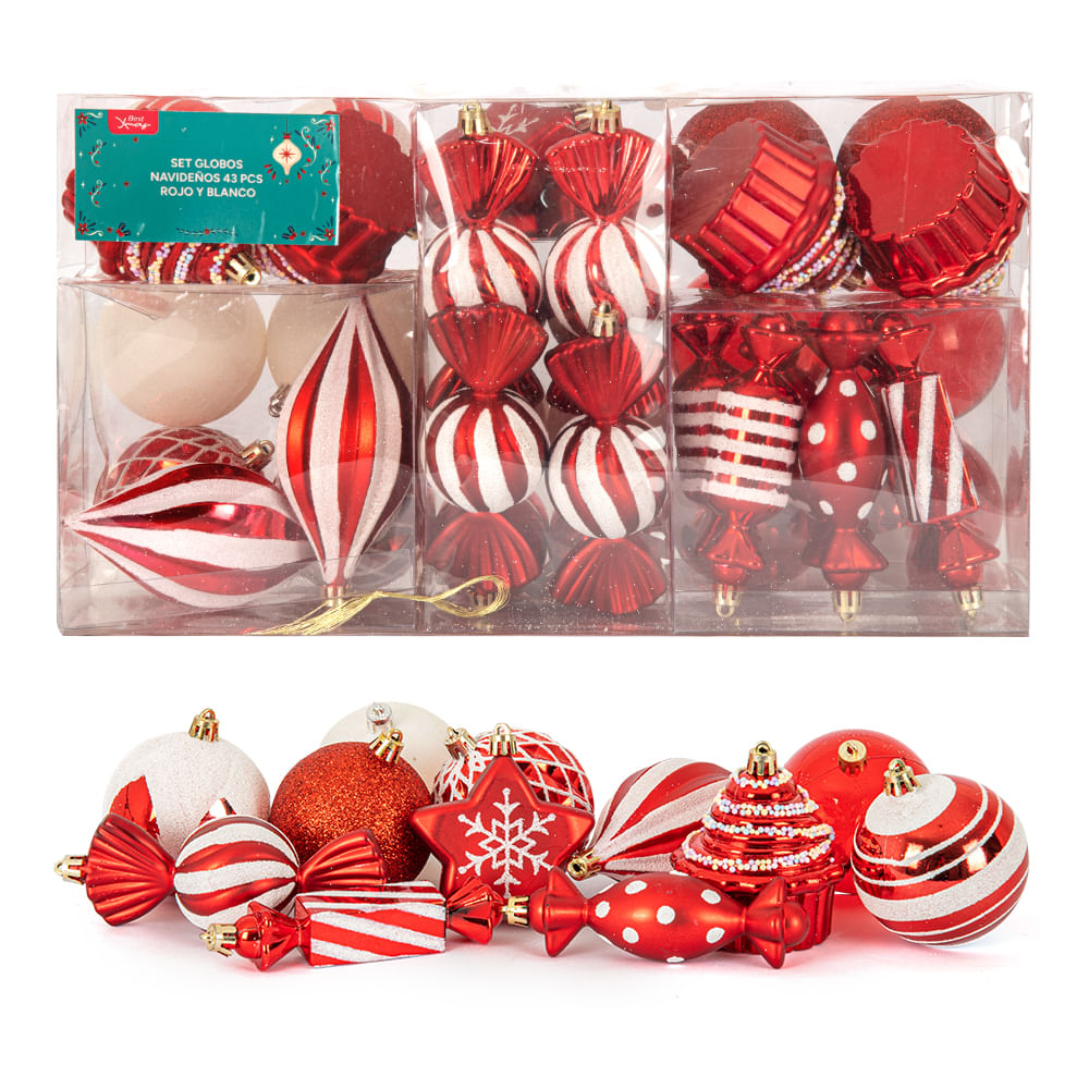 Set Globlos Navideños 43 Pcs Rojo Y Blanco